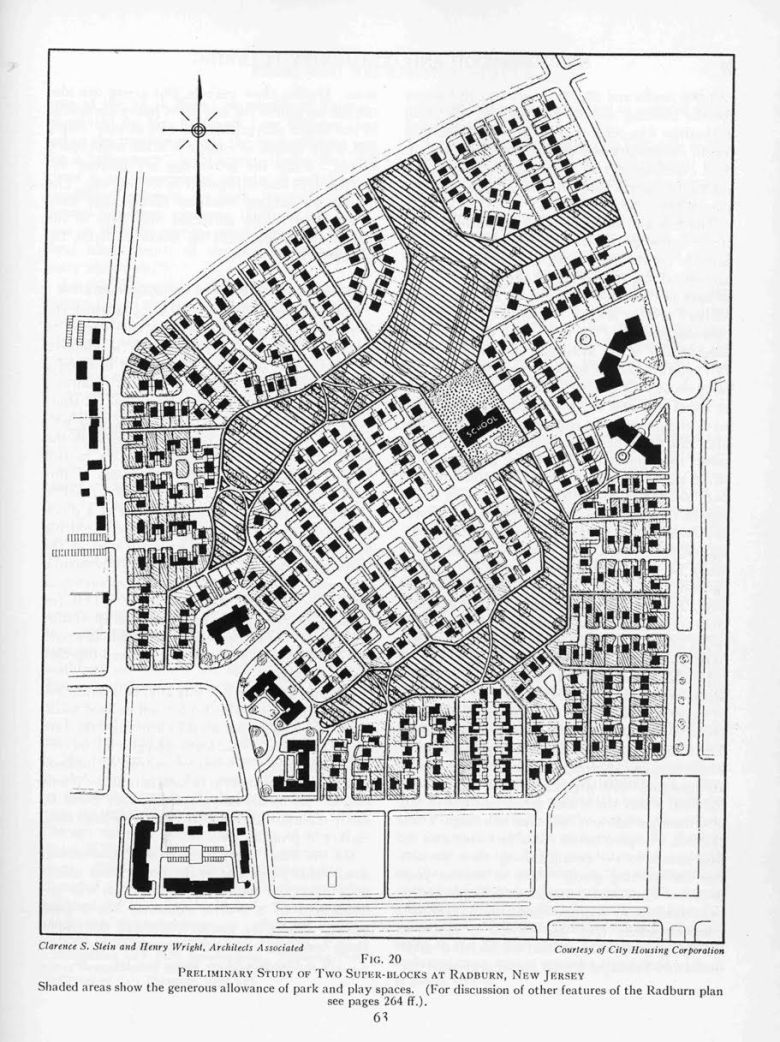 레드번 근린주구 계획. 기본원리는 간선도로가 수퍼블록을 둘러싸고 간선로와 통하는 쿨데삭과 가운데의 보행자 전용도로를 통해 보차분리를 실행합니다. 차량의 외곽에서 진입/주차할 수 있고 보행자는 빗금쳐진 보행공간에서 자유롭게 활동할 수 있지요.
