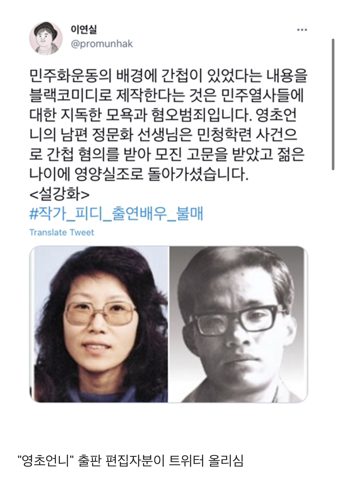 간첩 소재+절대 흔하지 않은 영초라는 이름 (실존인물 영초 남편은 민주화 운동하다가 독재정치자들한테 간첩 누명으로 사망하심 이건 뭐 일제강점기때 독립운동하다가 사망하신분을 친일파로 둔갑 시킨 수준)+안기부+빼박이라 그전부터 비판 나온거야.. 그리고 도대체 이글에 있지도 않은 인신공격글 캡쳐는 찬반에 왜 올리는건지 모르겠음