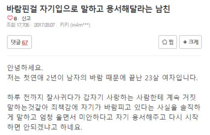 ㅂㅏ람핀걸 자기입으로 말하고 용서해달라는 남친