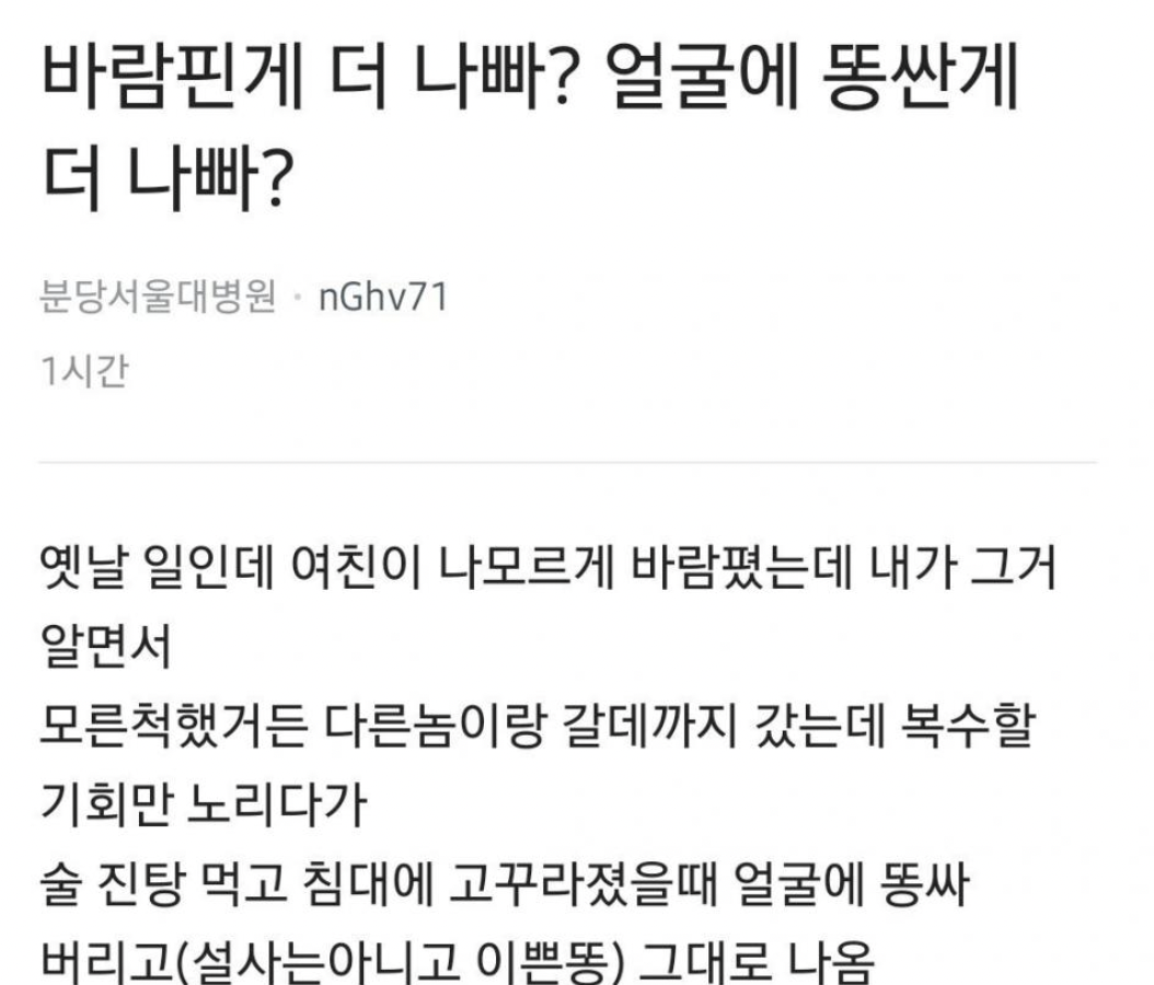 바람 핀 여자친구 얼굴에 똥을 싸버린 남자친구