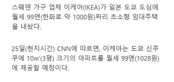 일본 도쿄 중심에 위치한 임대 주택의 월세가 1천원이라는데