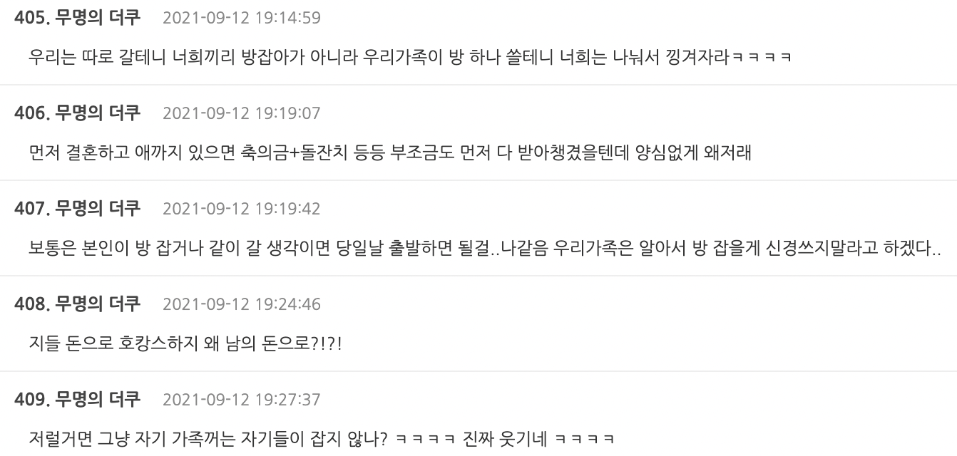 그러니까 방 세개 중에 하나를 저희 가족이 쓰고, 남은 방 2개를 1개는 2인실, 1개를 3인실로 하면 원래 방 세개 잡으려고 했던 계획이랑 똑같으니까요. 저도 남편 말 듣고 어차피 방 세개라면 큰 문제 없겠다 생각했죠. 그리고 위에 글을 썼듯이 방 2개로 결정한 상황도 아니었어요.