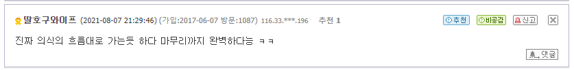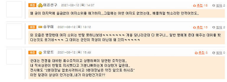 군대를 다녀온 사람이라면 이건 무조건 어의가 없지..그런데, 마지막 여자 소위는 왜 이야기를 하지.. 나도 조금 이해가 안되내