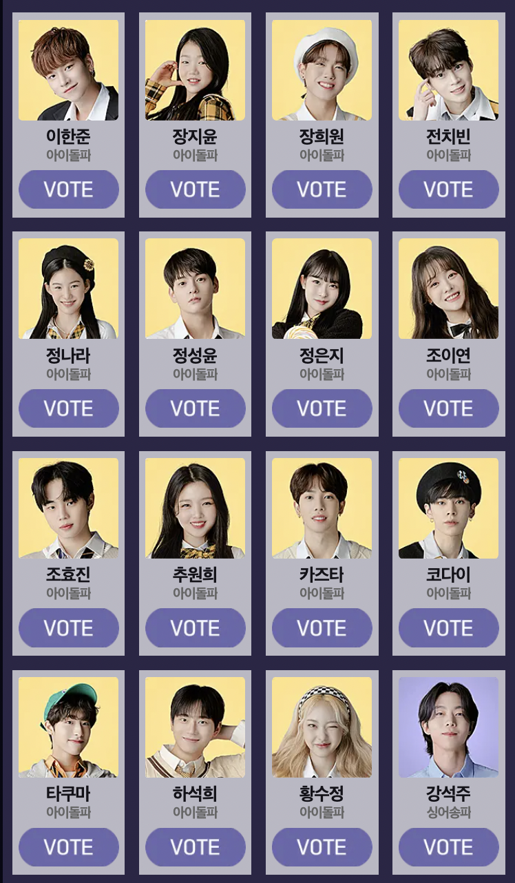 청춘스타에 참가하는 출연진들을 매주 투표를 할 수 있으며 본인이 선호하는 출연진을 실시간으로 투표가 가능합니다. 본인이 선호하는 청춘스타를 선택해보시길 바랍니다.